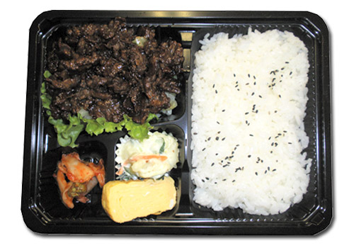 ヤキニク弁当 730円 特製タレに漬け込まれた牛バラ肉(150g)を使用。大変ジューシーで大好評です。 |