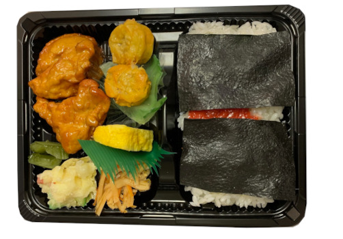パラダイス弁当 850円 さけ・エビフライ・からあげ×2・春巻・煮物・サラダ、バラエティなおかずが楽しめます。 |
