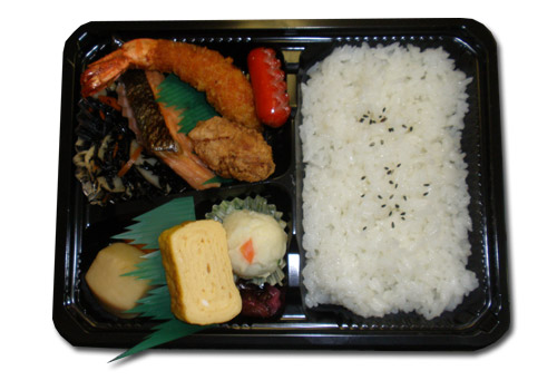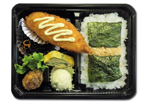 幕の内弁当 700円 さけ・エビフライ・からあげ・煮物サラダ、色んなおかずが楽しめます。 |