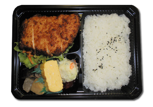 ヘレカツ弁当 730円 脂身のない豚ヘレ肉150gを生パン粉で揚げています。とんかつソース付。 |