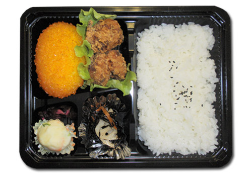 カラ・コロ弁当 520円 出来立ての熱々牛肉入りコロッケとカラアゲ×2。お腹いっぱいの定番メニューです。 |