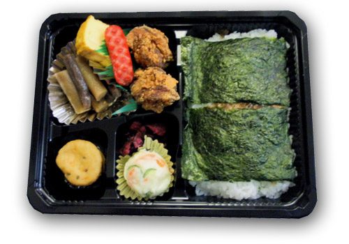 のり弁当 550円 ご飯と海苔の間に花かつお。なつかしい美味しさです。からあげ×2、たまご焼付。 |