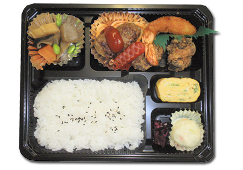 デラックス幕の内弁当 1,000円 さけ・ヘレカツ・エビフライ×2・煮物・サラダ、おかずがたっぷりで大満足。 |